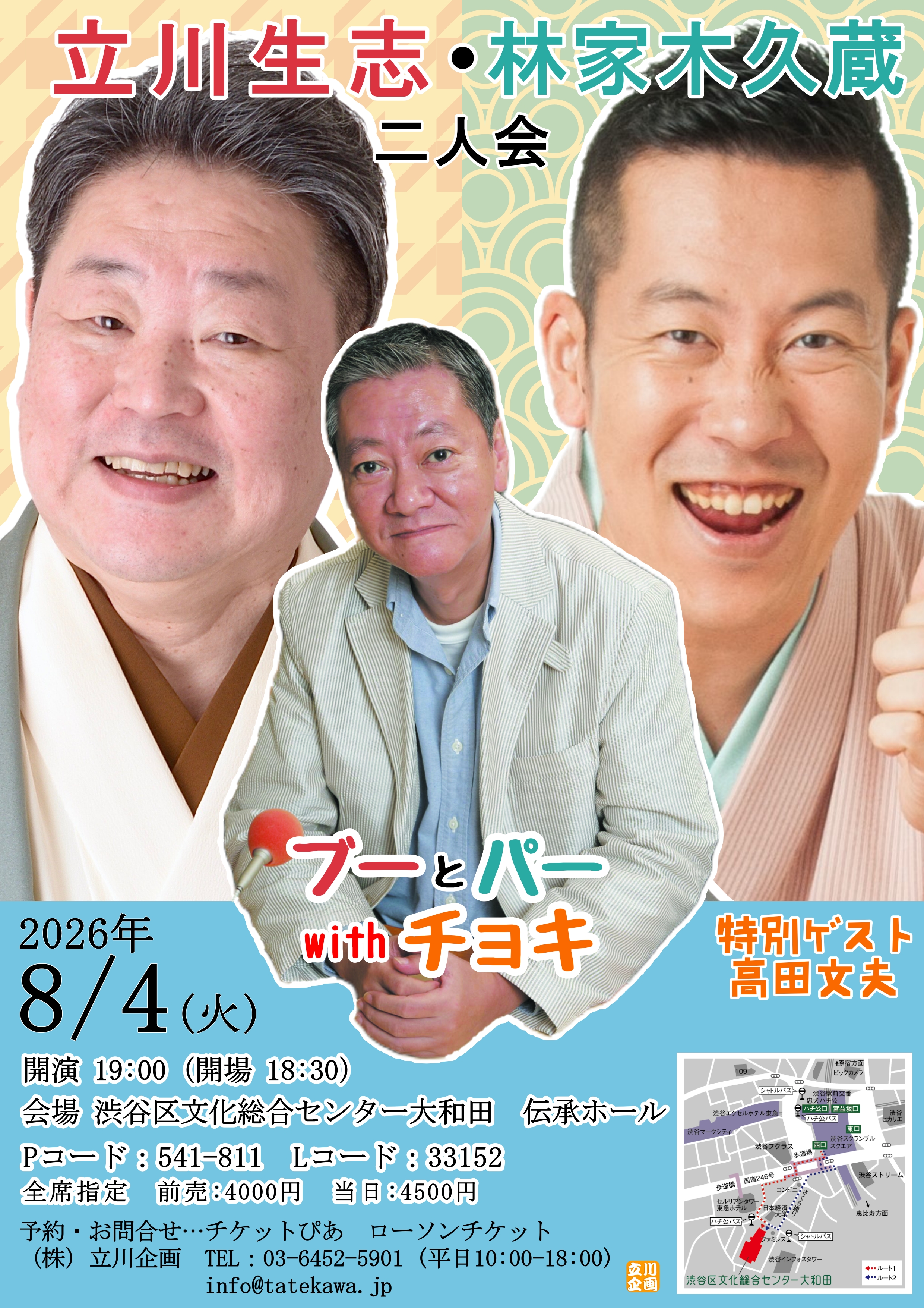 - 8/4「立川生志・林家木久蔵二人会ブーとパーwithチョキ」のスケジュール追加しました。