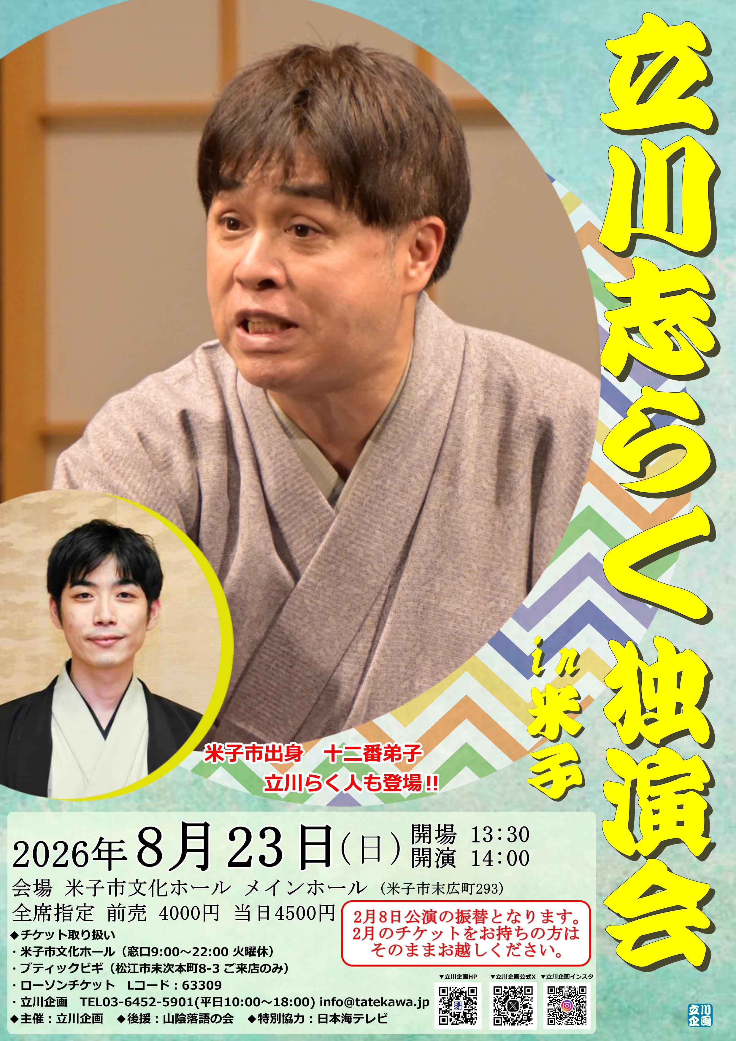 - 8/23「立川志らく独演会 in 米子」振替公演のスケジュール追加しました。