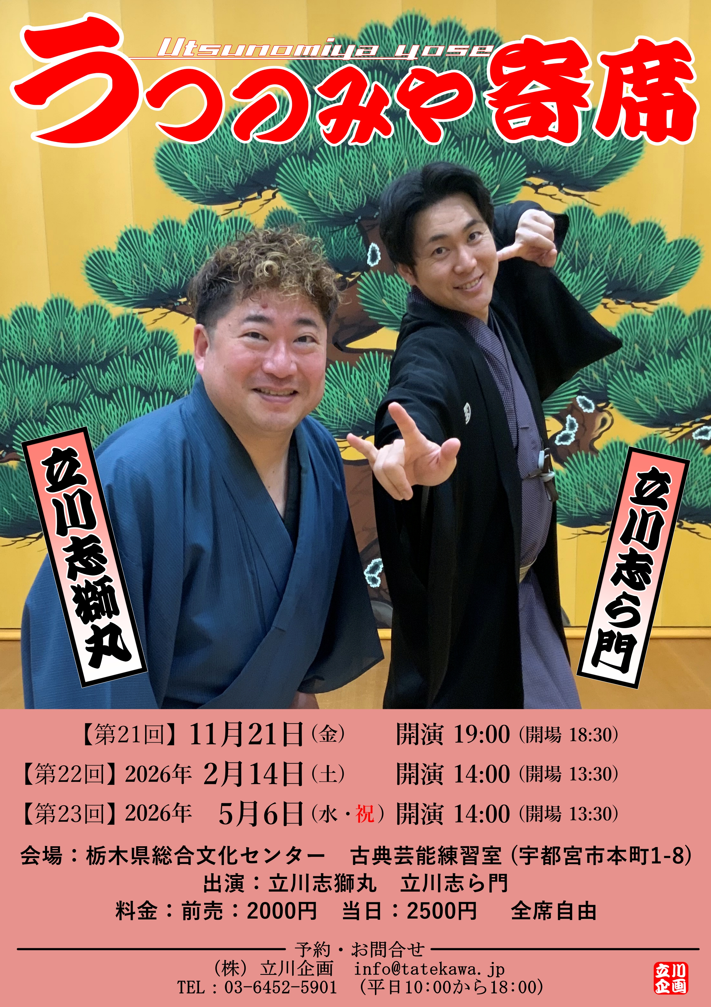 - 2/14 うつのみや寄席 2/14立川志らく独演会 2/27下丸子らくご倶楽部のスケジュール追加しました。